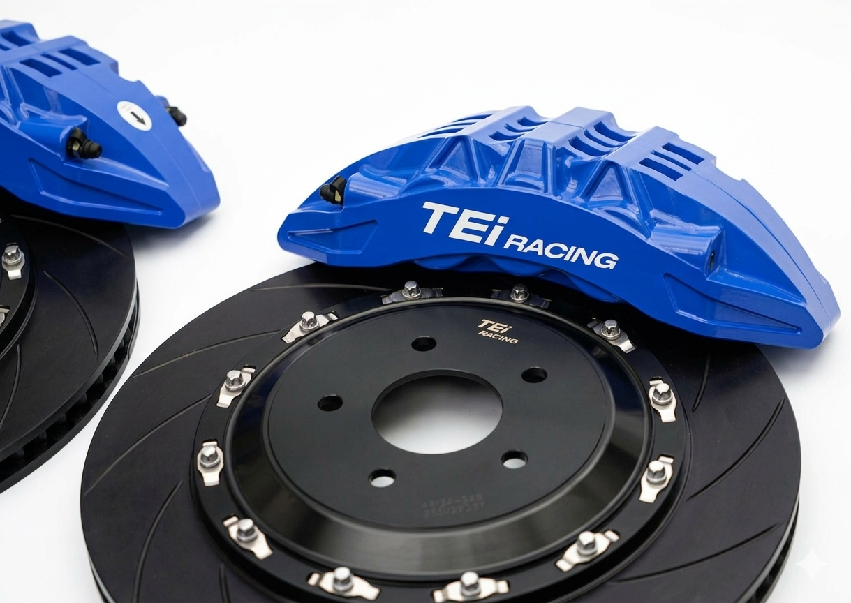 Forged Calipers: Lightweight, high-strength aluminum calipers featuring the official TEI Racing logo.